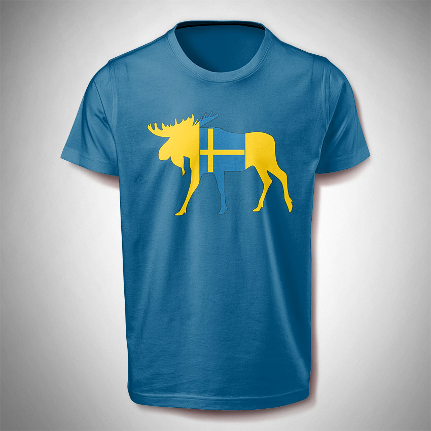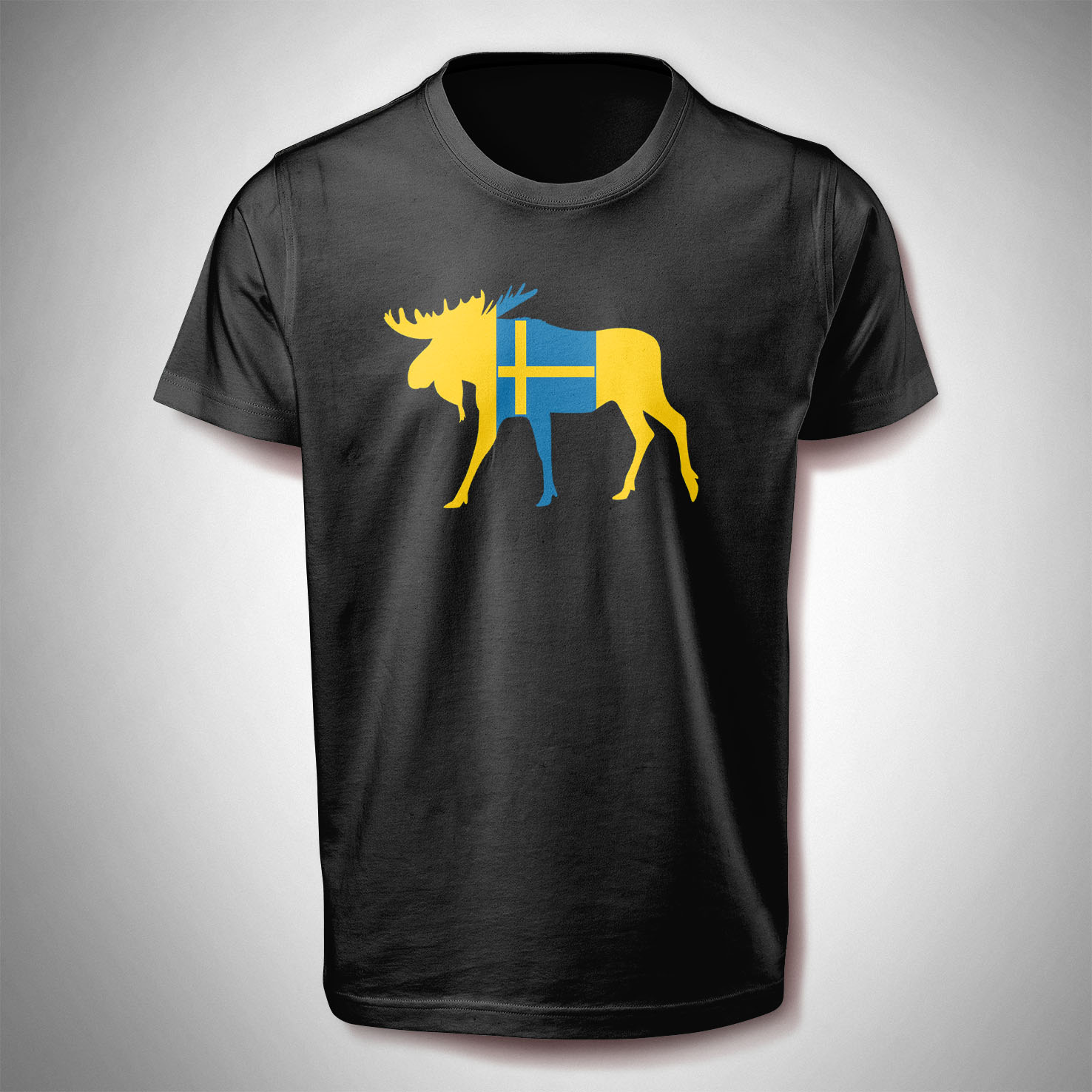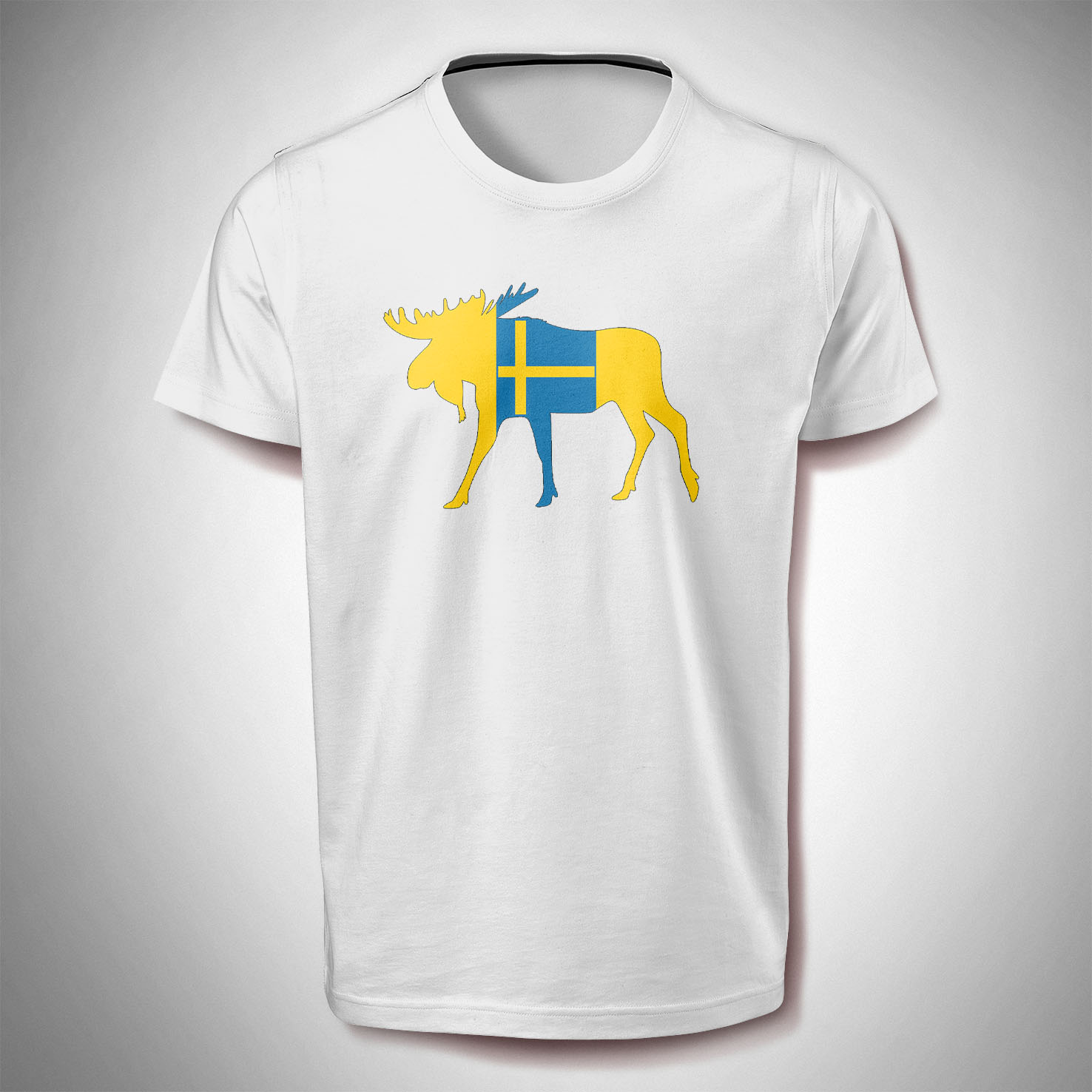 Unisex T-Shirt mit dem ‚Elch mit Schwedenflagge‘ Motiv. Das Shirt besteht aus 100% Baumwolle.