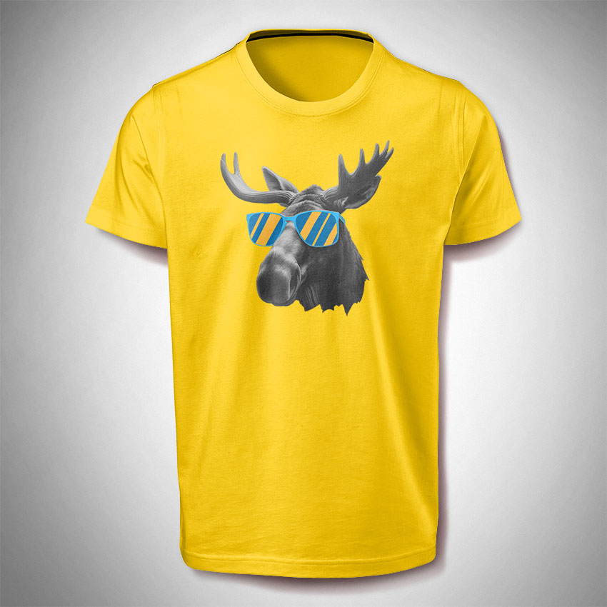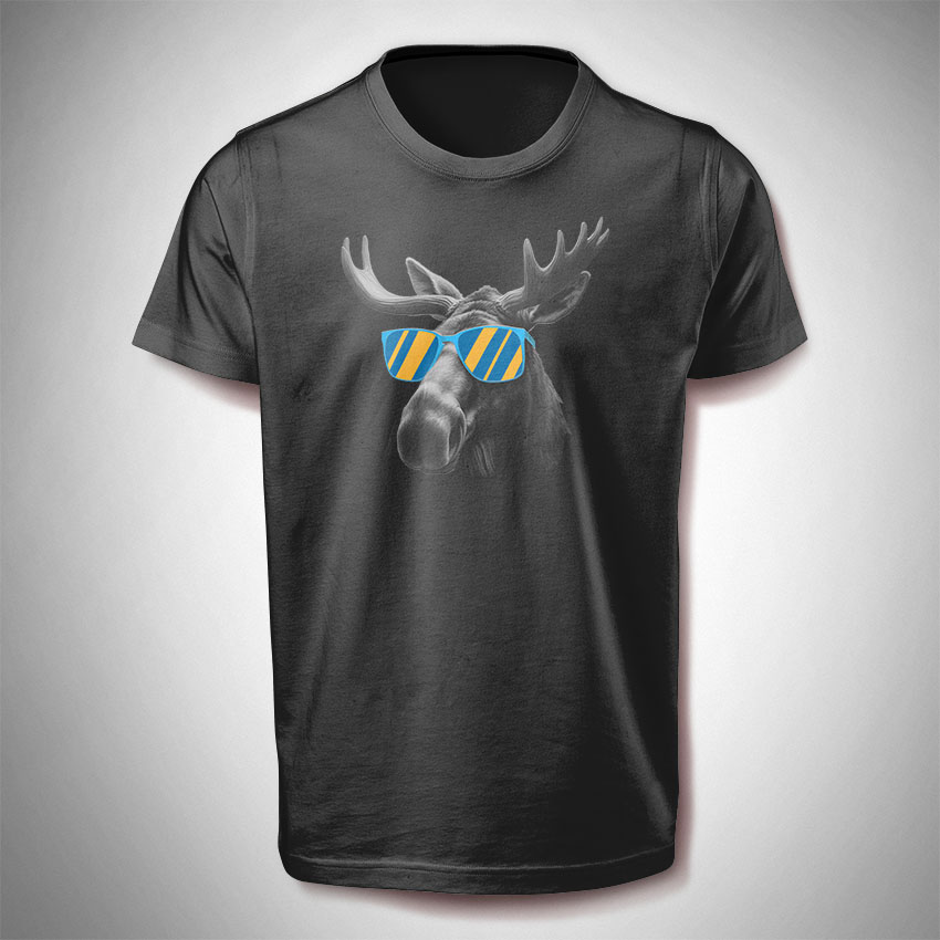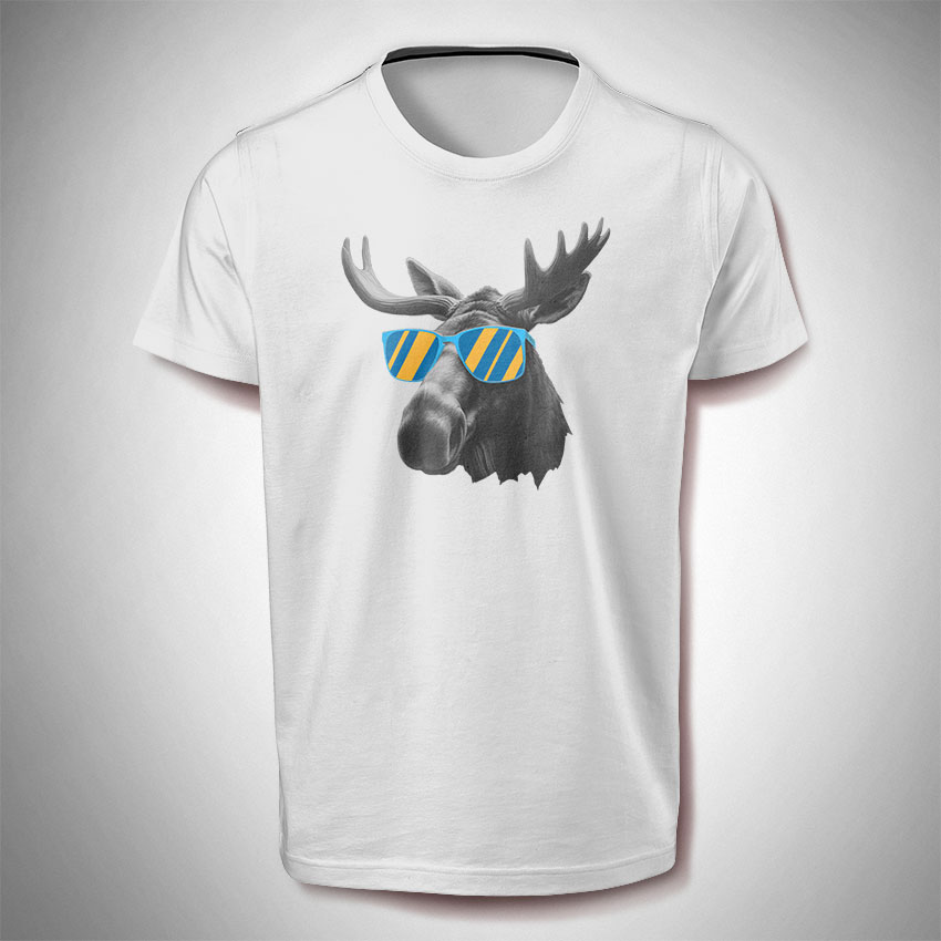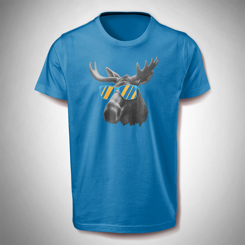 Dieses Shirt wird mit dem Motiv ‚Elch mit Sonnenbrille‘ bedruckt und ist für Frauen sowie für Männer. Das Motiv hat eine Breite von ca. 30 cm und befindet sich im Brustbereich.